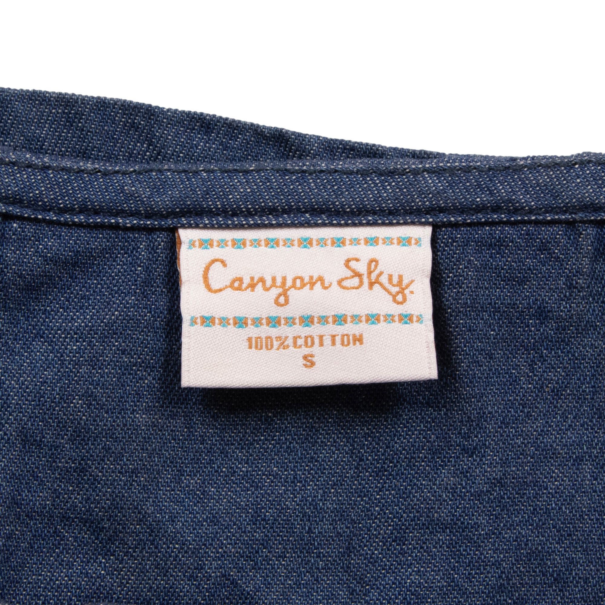 - Sport a feminine look in the Canyon Sky women's embroidered denim long sleeve peasant shirt designed for casual everyday wear.