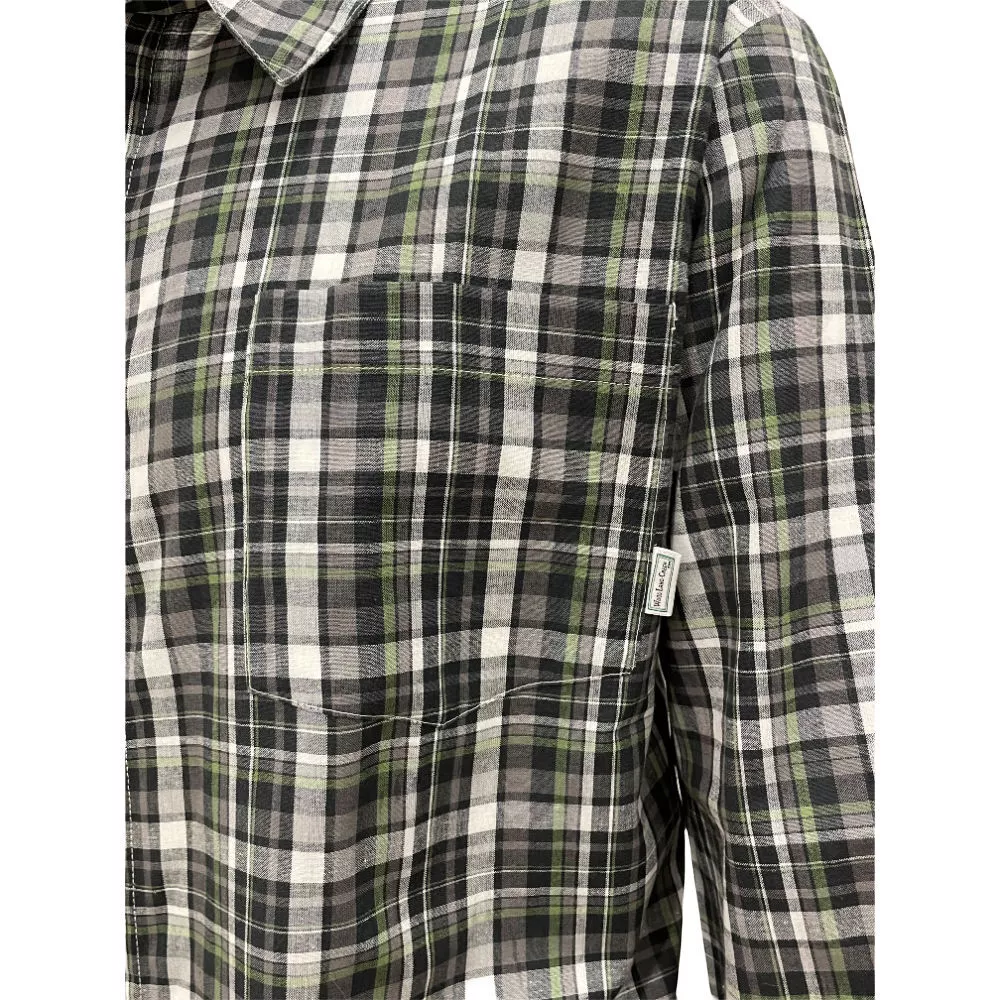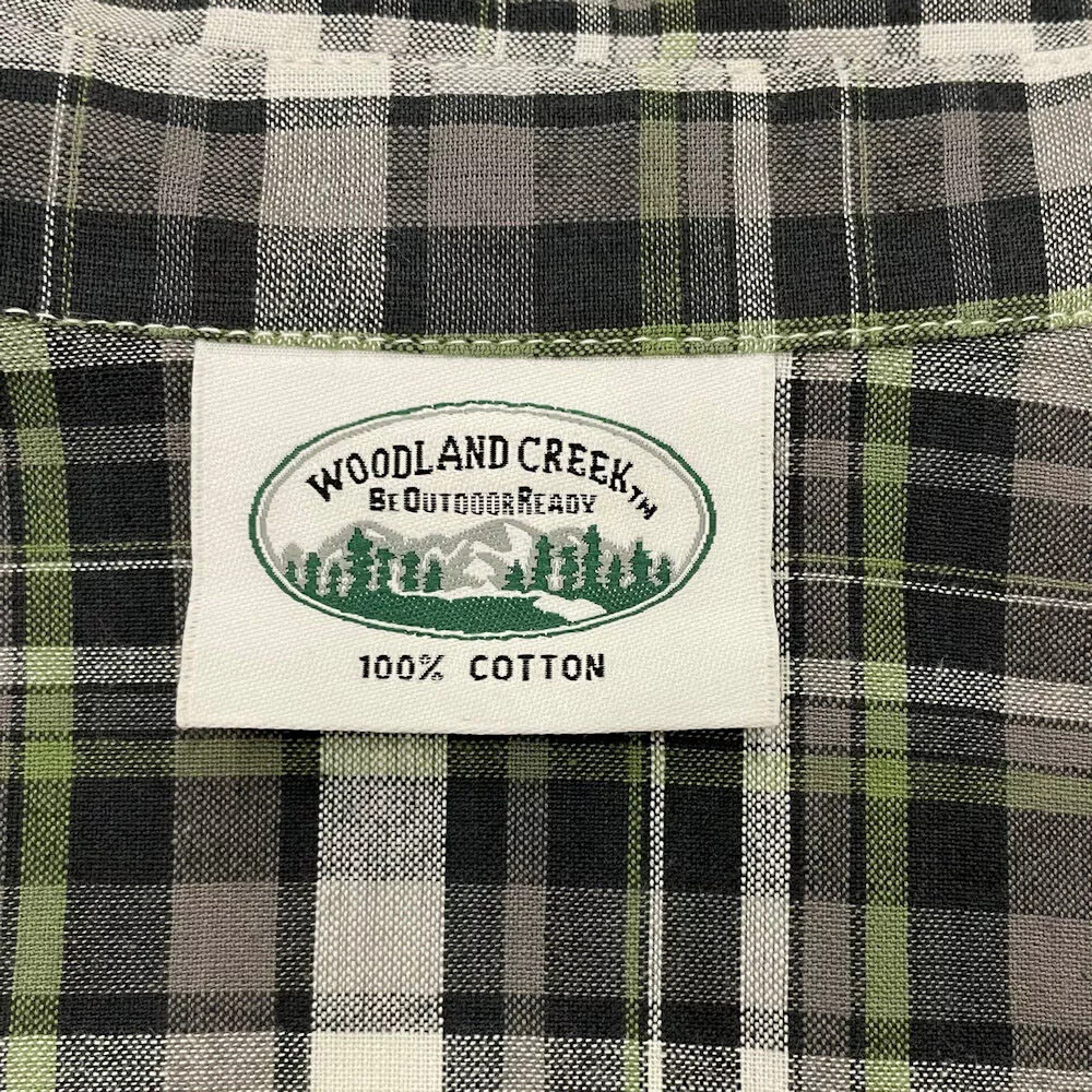 Versatile and stylish, the Woodland Creek Men's Long Sleeve Button-Up Shirt is perfect for casual everyday wear. This men's long sleeve shirt in a black and green plaid print features a pointed collar, a front button-up closure, a front left chest pocket, buttoned cuffs, and a regular fit. Made of 100% cotton, this lightweight men's shirt is breathable for optimal comfort and machine washable for easy care. Made in India. Tagged a men's shirt size medium. Measurements: 25" Chest, 28.5" Length, 25" Sleeve Length.