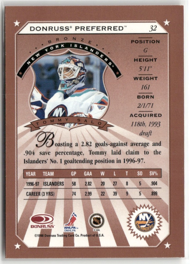 | 1997-98 DONRUSS PREFERRED BRONZE TOMMY SALO NEW YORK ISLANDERS #32 |