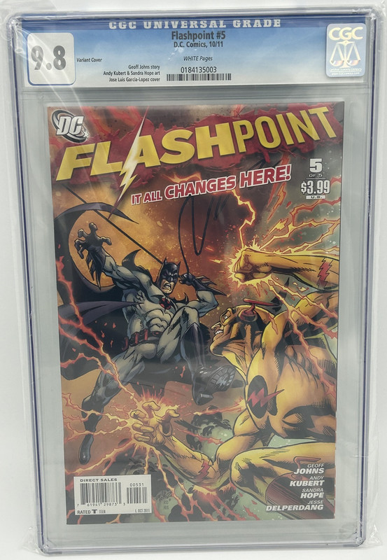 A beautiful copy of Flashpoint #5 with a fantastic cover by Jose Luis Garcia-Lopez. This variant has been CGC graded at 9.8. Perfect condition. I am not a dealer but a discerning collector who is weeding out my collection. Please feel free to ask questions. Win more than one auction and I will save you on shipping. Winning bidder will pay $10.00 postage and handling for this item. As always there are no reserves on my auctions. I have been selling on eBay since 1996 so please bid with confidence. Email questions are welcome and as always thanks for looking!