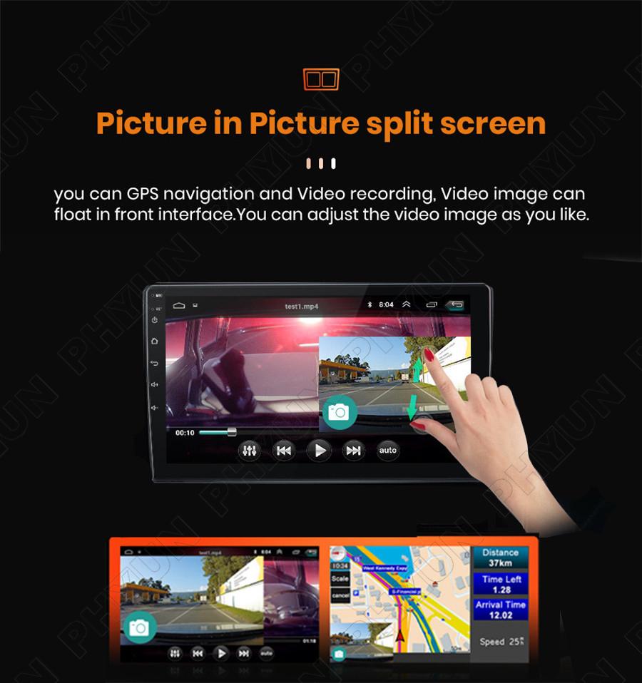 Display | - Touch Screen: Yes - Resolution: 1024*600 - Capacitive or Resistance Screen: Capacitive - Built-in Clock and Calendar: Yes, show real time and can use network-provided time - Main Menu Status Bar display: Can be changed to Music/Radio/BT-Stereo Player and Clock/Date/Week - Change Apps-Icon Position: Yes - Picture in picture split screen:Yes |