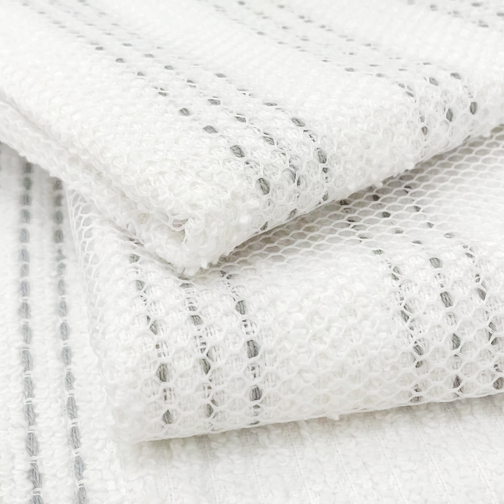 - The set includes 2 Kitchen Towels, 1 Dish cloth and 2 Mesh Scrubber Cloths in white with grey stripes.