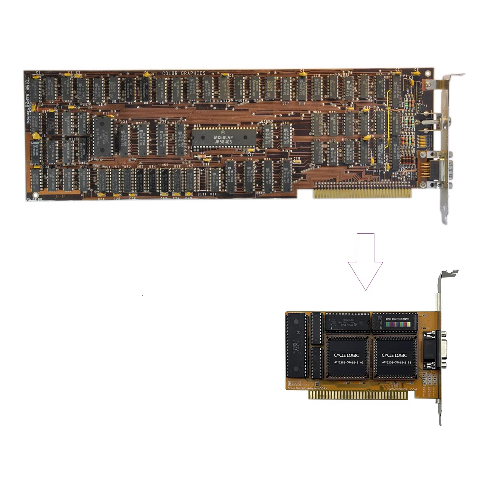 The CGA graphics card with ISA interface. This interface still plays an important role in the for Pentium for Celeron processor. Plug this graphics card into PC with an ISA interface, it will still work normally.
