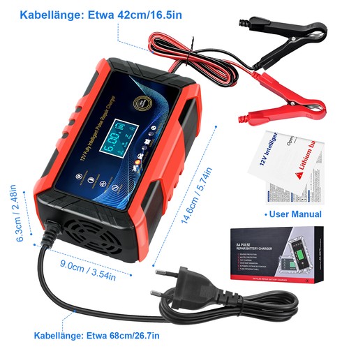 Auto-Batterie-Ladegerät, auch Batterie-Wartungsgerät, Impuls-Reparatur-Funktion kann helfen, Ihren Verlust Batterie zu reparieren und verlängern die Lebensdauer der Batterie. Hinweis: Es kann nicht eine tote Batterie aktivieren oder eine Batterie reparieren, die schwer beschädigt ist; es kann auch nicht eine Batterie zurück zu 100% neu reparieren.