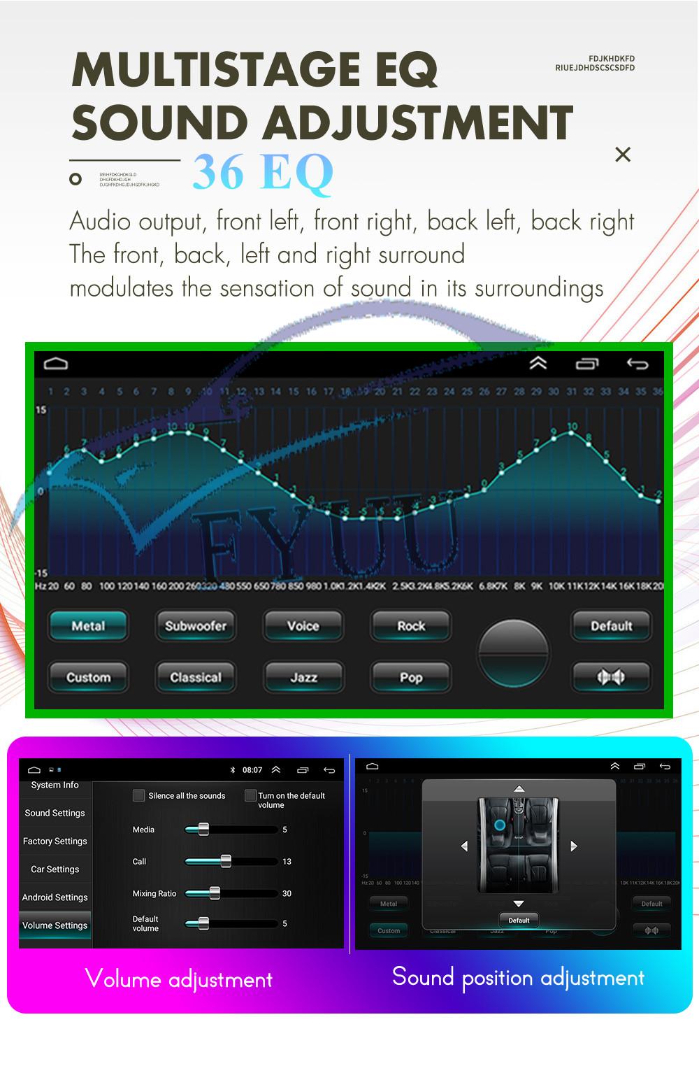Setup | - WiFi/Hotspot/Bluetooth: Yes - Brightness level adjustable: Yes - Wallpaper: Wallpapers/Live Wallpapers/Gallery - Sound: Key Tone & Volume - Storage: Display Internal Storage/Nand Flash/Connected Device Storage - Apps: Running Apps display/force stop/uninstall - Security: Yes - Accounts: Yes - Languages and Input: more than 70 Languages and choose input method - Backup and Reset: Yes - Date and Time: Setting Date&Time by yourself or choose GPS/network-provided time - Accessibility: Yes - GPS: Yes, GPS application options/monitoring/sound mode/mixing ratio - Driving safety: Watching Video, Reversing X-mirror/Volume, Reversing Trajectory/radar Display, Rear view ruler - Amplifier: Rock/Pop/Jazz/Classic/Flat/Voice/Custom - Steering Wheel Control: Yes - About Device: Display Parameter Info. |