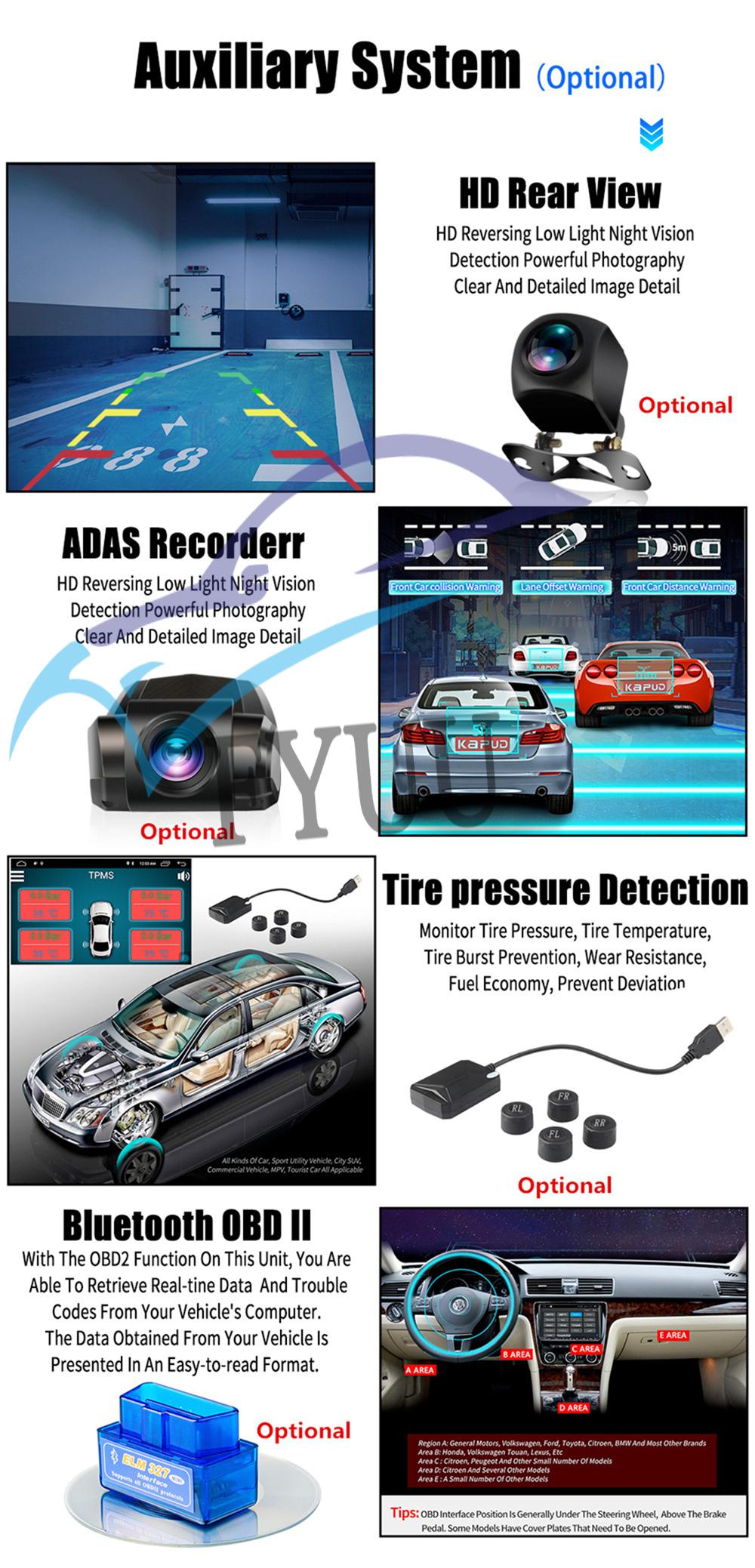 Additional | - Textbook: Could change font, font color, background color, bookmark, reading E-book while listening music - Photo Viewer: Support JPS, BMP, PNG, GIF etc. format. play by revolve, Powerpoint Support 4096*4096 Pixels - Wallpapers: 5 live wallpapers, 17 standard wallpapers, support DIY wallpaper from Gallery - APK Installer: Support Android Package installer - Support Torque Pro(OBD2 &Car): Yes, you can connect a Bluetooth/WIFI OBD2 Scanner Tool(Bluetooth version ≥ 4.2) to use this function - Support Mirror Link function: Yes, support wireless and wired screen mirroring from iPhone and android smartphone - Support TPMS: YES (Not Included) - Support Steering Wheel Control;Yes |