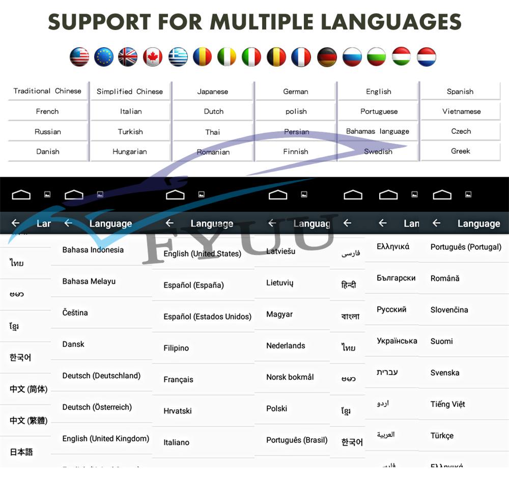 Setup | - WiFi/Hotspot/Bluetooth: Yes - Brightness level adjustable: Yes - Wallpaper: Wallpapers/Live Wallpapers/Gallery - Sound: Key Tone & Volume - Storage: Display Internal Storage/Nand Flash/Connected Device Storage - Apps: Running Apps display/force stop/uninstall - Security: Yes - Accounts: Yes - Languages and Input: more than 70 Languages and choose input method - Backup and Reset: Yes - Date and Time: Setting Date&Time by yourself or choose GPS/network-provided time - Accessibility: Yes - GPS: Yes, GPS application options/monitoring/sound mode/mixing ratio - Driving safety: Watching Video, Reversing X-mirror/Volume, Reversing Trajectory/radar Display, Rear view ruler - Amplifier: Rock/Pop/Jazz/Classic/Flat/Voice/Custom - Steering Wheel Control: Yes - About Device: Display Parameter Info. |