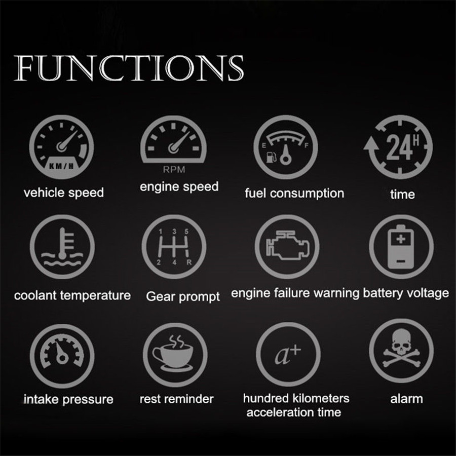 HUD short for Head Up Display.It displays driving datas on the front windshield such as speed, rpm, fuel consumption,water temperature,voltage;avoiding drivers become dangerous because of watching the instrument while driving.Drivers can read the driving information instantly,and can always keep the best state on the way with HUD.