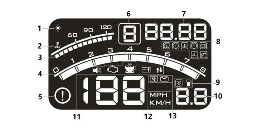 8.Icon for engine RPM,inlet pressure,water temperature,clock,voltage,ignition angle,acceleration time for 100 Kilometers