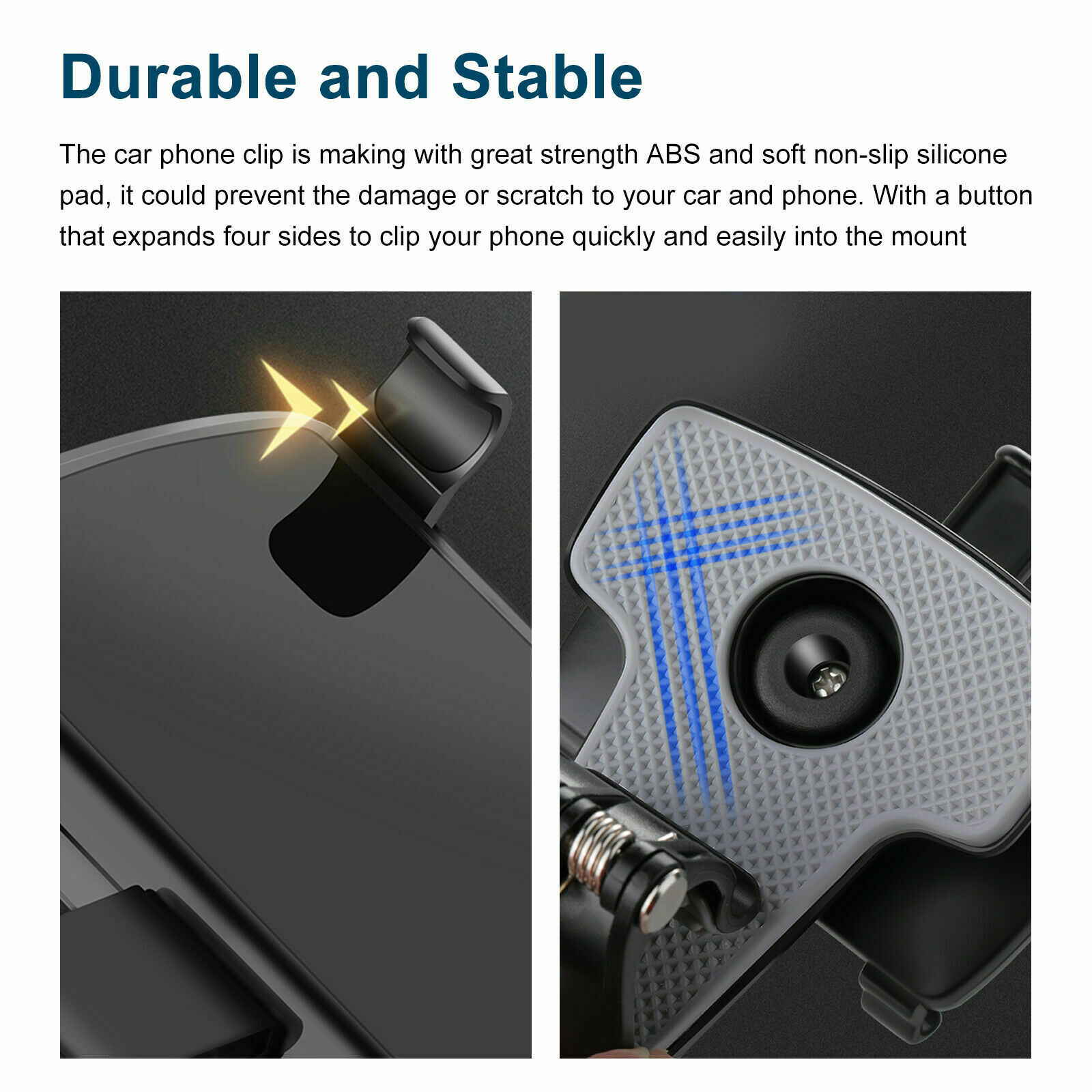【Curved Base Design】Made with a soft, non-slip silicon pad and curved base. The phone holder can be attached to the car dashboard or curved surface and firmly hold your device to prevent them from scratching and dropping. Spring buckle base cannot be shaken off, strong and sturdy.