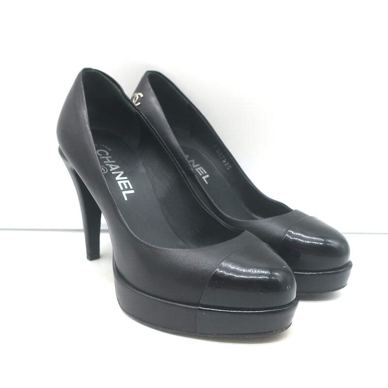 Chanel’s cap-toe pumps are celebrated for their refined proportions and quality craftsmanship—styles like this one are frequently praised by fashion editors and resale collectors for their timeless appeal and strong secondary market demand. This pair combines smooth leather with glossy patent cap-toe detailing and a platform heel for a dressy, lengthening profile.