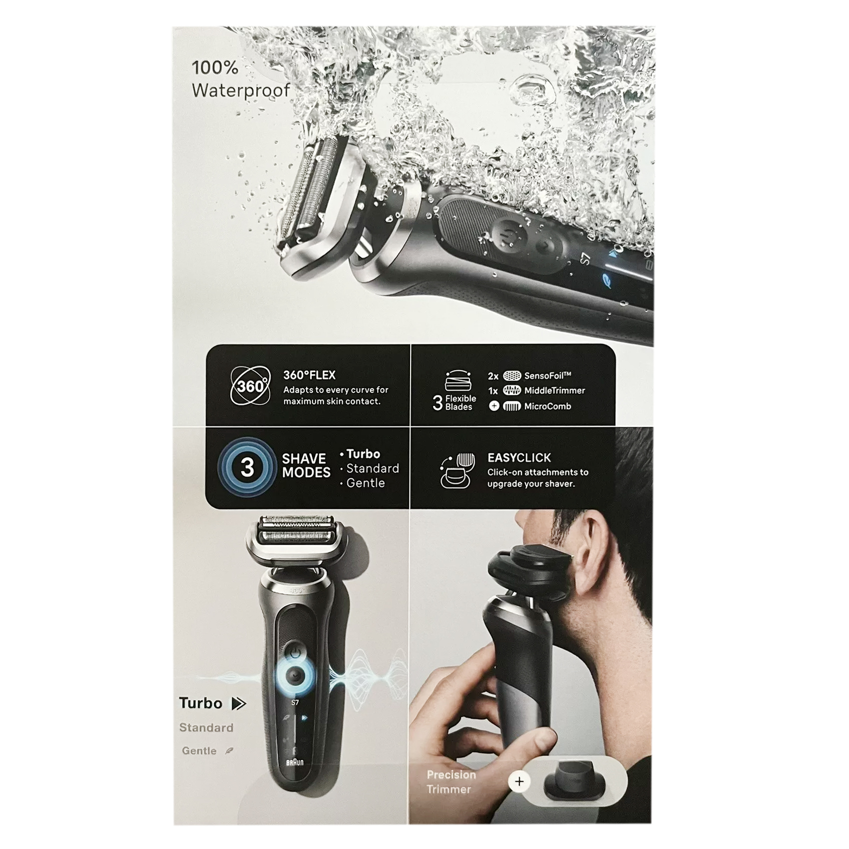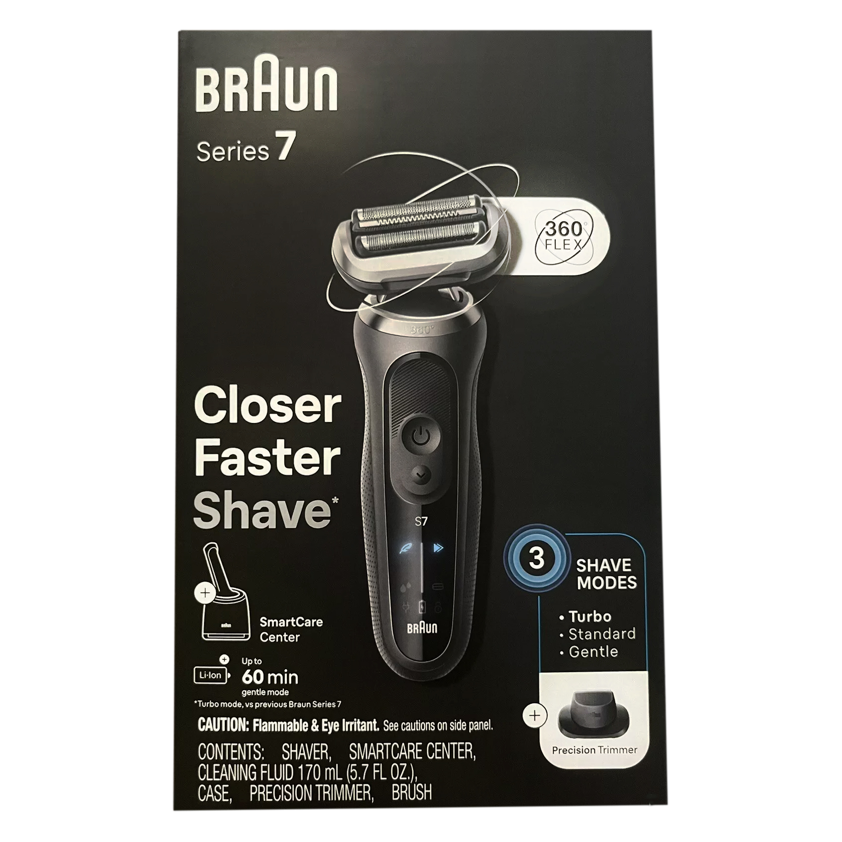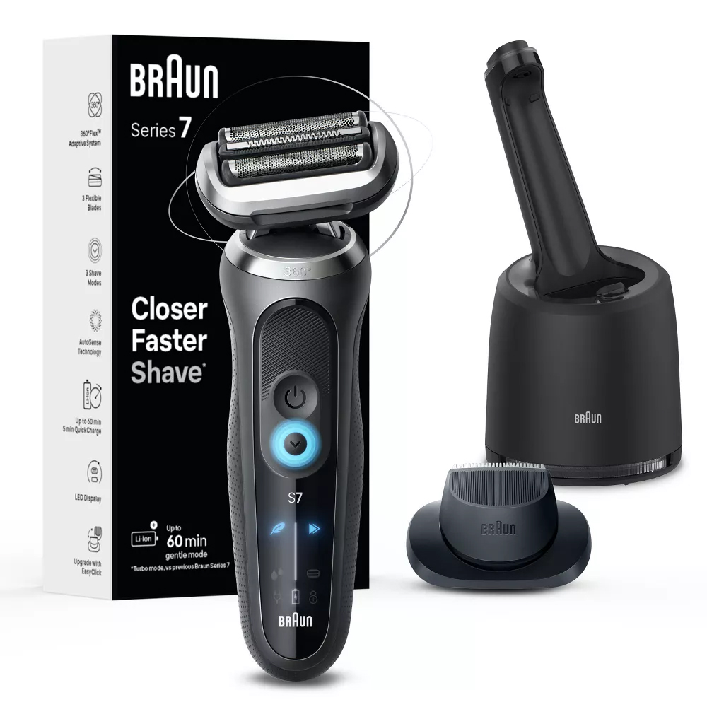 Braun Series 7 7171cc electric shaver for men delivers a close shave faster, thanks to the floating 360 degrees Flex Head that adapts to your contours for an extremely close shave, even in tricky areas. To easily customize your shave, select Turbo mode for an extra fast shave, Gentle mode for a gentle shave on sensitive skin, or Standard mode for a balanced shave. Easily upgrade your shaver with different attachments for all your grooming needs. Includes a SmartCare center for a shaver like new, every day. Made to adapt to your shaving needs, this waterproof electric shaver features AutoSense technology that adjusts power to your beard density. The men's shaver is made in Germany for guaranteed quality. Box includes: 1x Series 7 shaver, SmartCare Center, Cleaning Brush, Precision Trimmer and pouch.