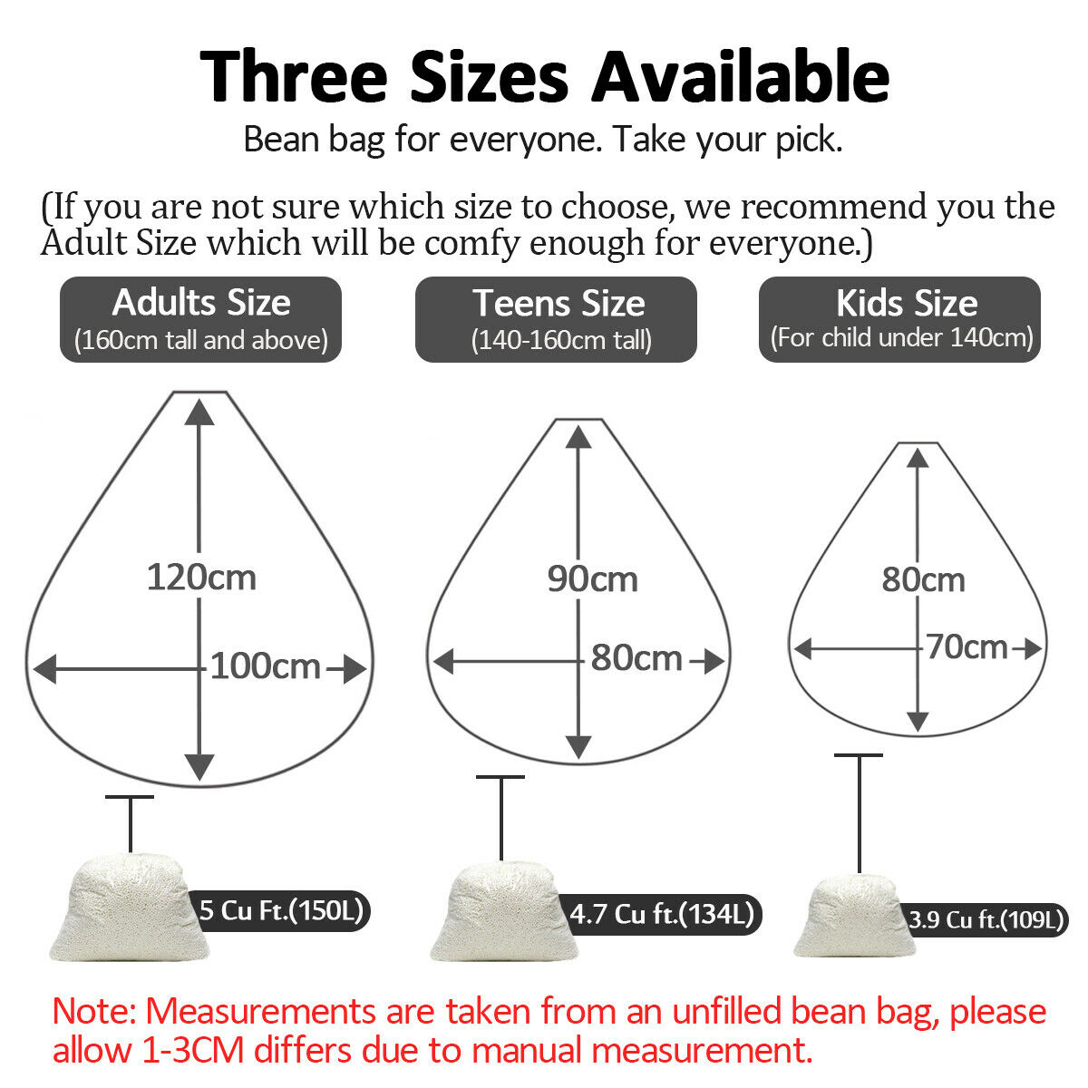 -Measurements are taken from an unfilled flat bean bag, please allow 1-3CM differs due to manual measurement.