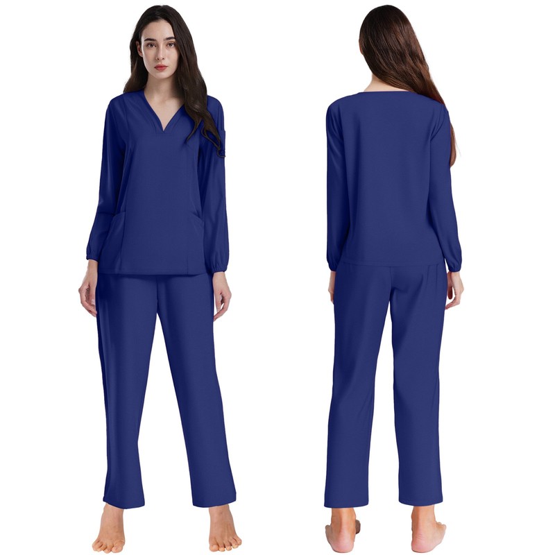 The V-neck long-sleeve top with pockets is both practical and stylish, adding a modern touch to the classic scrub look.