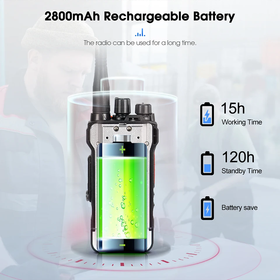 Large battery capacity and battery save function allows the walkie talkie to be used for a long time and improve working efficiency.