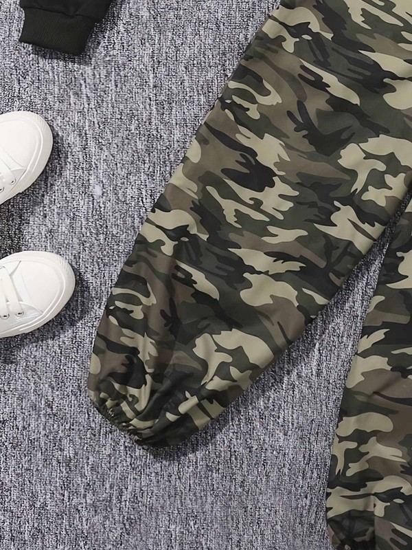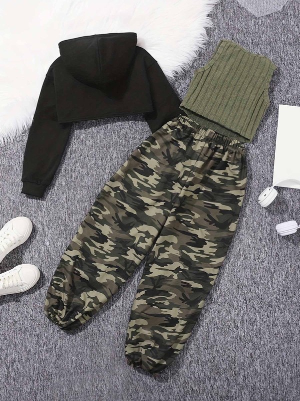 The striped texture tank top and camouflage sweatpants provide a stylish contrast, creating a fashionable and coordinated outfit that follows the current fashion trends.