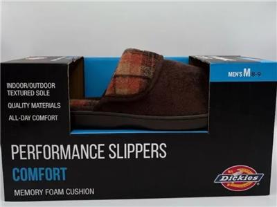 Slip into the ultimate comfort with Dickies Men's Slippers, designed to cradle your feet in plush memory foam. The synthetic upper in a classic brown plaid pattern offers a stylish touch, while the slip-on design ensures ease and convenience. Perfect for casual days at home or quick trips outside, thanks to the indoor/outdoor textured sole. Whether you're lounging around the house or stepping out for a quick errand, these slippers provide all-day comfort. New with tags. Keywords: Dickies slippers, men's slippers, memory foam, indoor/outdoor, casual footwear, slip-on, plaid pattern, comfortable slippers, fall footwear, closed toe, synthetic material, brown slippers, all-day comfort, flat heel, new with tags. Brand: Dickies Style: Slipper Upper material: Synthetic Color: Brown Department: Men Us shoe size: 8-9 Insole material: Memory Foam Outsole material: Synthetic Type: Slipper Heel height: Flat (Under 1 in) Features: Memory Foam Cushion, Indoor/Outdoor Textured Sole, High-Quality Materials, All-Day Comfort Pattern: Plaid Closure: Slip On Occasion: Casual Season: Fall Toe shape: Closed Toe Country/region of manufacture: China