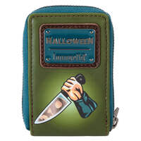 Crash the haunted hayride party looking sharp. Bring along Loungefly's Halloween Accordion Wallet. This accessory features a window view of Michael Myers, peeking through the applique shutters on the front. A jack-o'-lantern sits on the windowsill, and in the dark, the facial features glow! Michael Myers brandishes a knife, and you can see him through the clear PVC material of the "window." The gleaming knife makes an encore appearance as a print on the back. Secure credit cards, your ID, hotel key, or business cards...and stalk your favorite haunts in style.