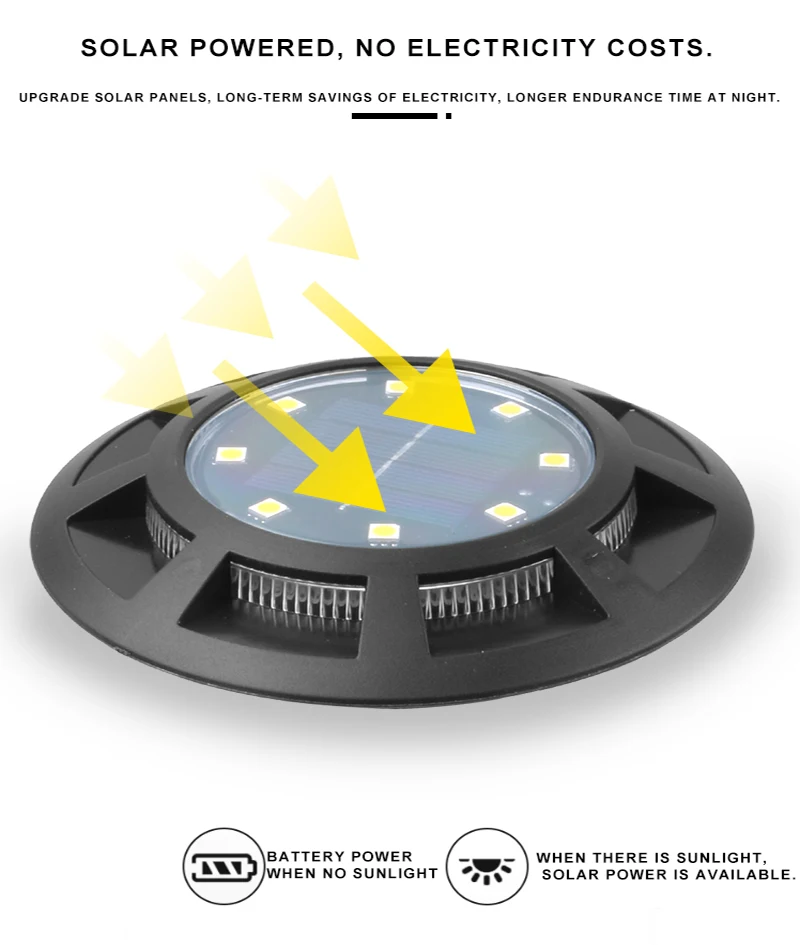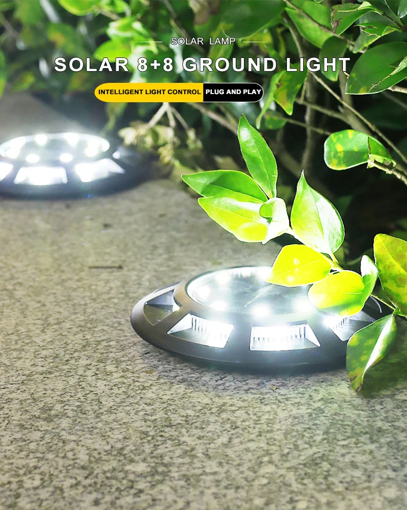 Solar 8+8 Ground Light, Smart Light Control, Plug and Play, Product Function Introduction, Solar Charging, Plug and Play, Lighting Mode, Smart Light Control, Zero Electricity Cost, Rainproof and Sunscreen, No Wiring Required, Leakage Protection.