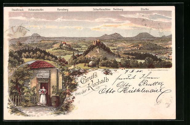 Lithographie Donzdorf, Gasthaus Kuchalb, Scharfenschloss, Staufeneck