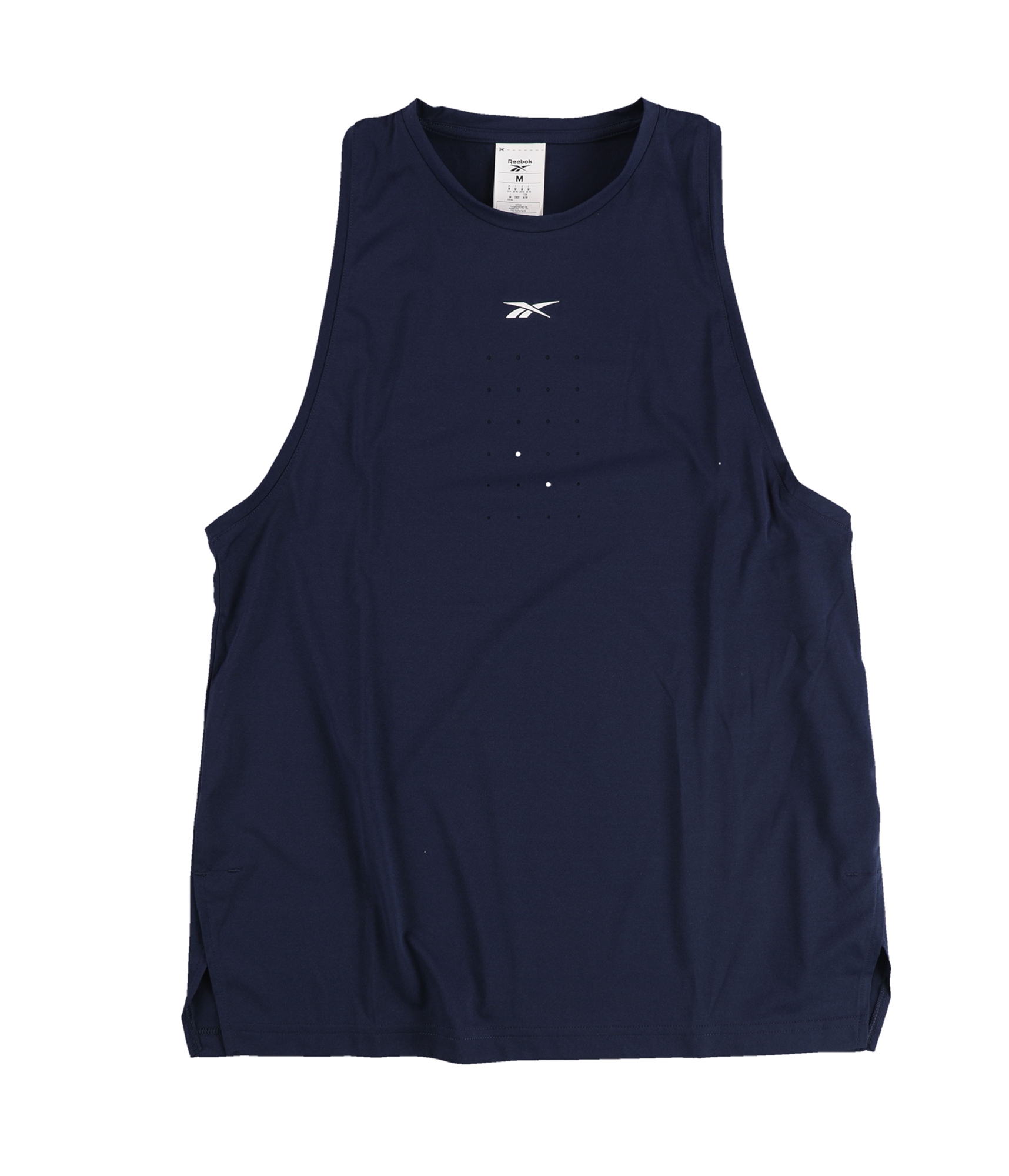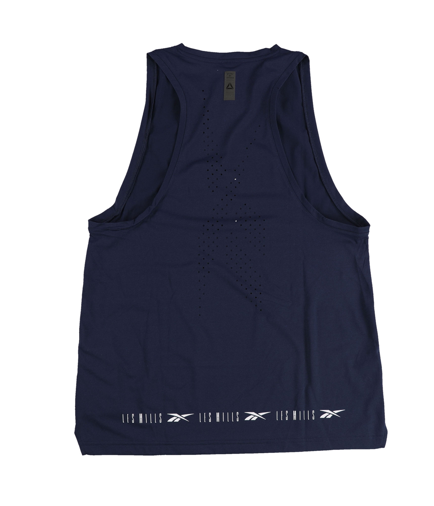 Additional Details: Perforated in the shape of the Reebok logo on the back. Side split hem. Les Mills with reebok logo at the back bottom