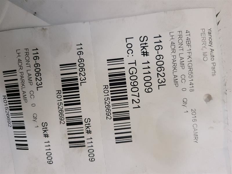 This listing is for a USED 15-17 TOYOTA CAMRY Driver LH Lamp Turn Signal Light . This part was removed from a 2016 CAMRY stock number 111009 and the mileage was 53000 miles. Part Condition Notes: LH,4DR,PARKLAMP This part will fit these makes and models with these options: CAMRY 15-17 (Park Lamp-Turn Signal), (bumper mounted), w/o LED daytime running lamp; L.
