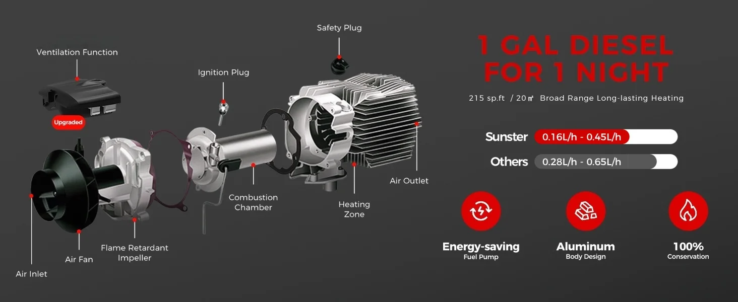 Universal Dual Power Input (12V/24V DC & 110V-240V AC): Sunster diesel heater compact automatically switches between vehicle and household power, allowing you to use it both on the road or at home. Perfect for those looking for versatile heating solutions across various settings.