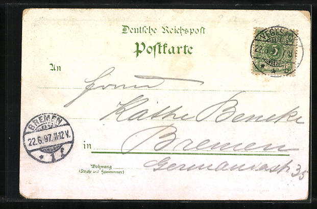 gelaufen 1897, Ecken bestoßen mit Abriebspuren, guter Zustand