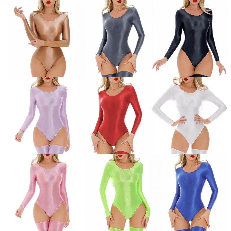 Long sleeve, round neckline bodysuit is designed with pull on closure. Glossy appearance.