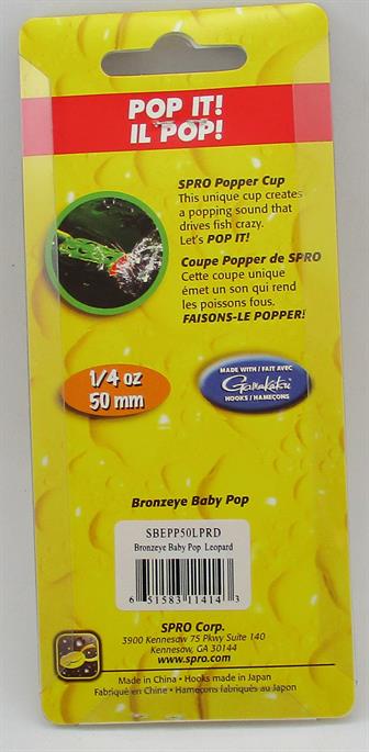 Spro SBEPP50LPRD Bronze Eye Popper Frog Size 50mm Weight 1/4 oz The Spro Dean Rojas Signature Series Bronzeye Popper Frog was designed to attract bass out of the thickest cover with its loud popping sound Use it to walk-the-dog, pop it or chug it, the Bronzeye Poppin Frog casts like a rocket and is weighted to land upright every time The live rubber legs can also be cut down to further manipulate the frogs action The Bronzeye Popper also comes equipped with specially designed 3/0 Gamakatsu Hooks that fit the bait perfectly for solid hook ups When the frog bite is on, the Spro Bronzeye Poppin Frog a great counterpart to the original Spro Bronzeye Frog The Spro Bronzeye Popper is perfect for changing up your presentation and picking up all the fish the other guys missed throwing regular frog baits Color LPRD - Leopard |