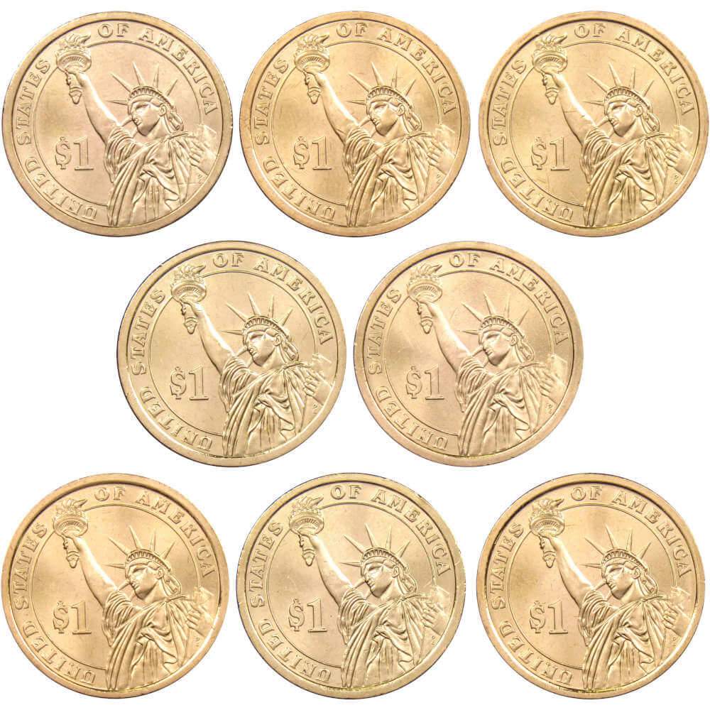 This 8 coin set includes all 2010 Presidential dollars issued by both the Philadelphia and Denver mints, featuring designs honoring former presidents Millard Fillmore, Franklin Pierce, James Buchanan, and Abraham Lincoln, in Uncirculated Mint State condition.