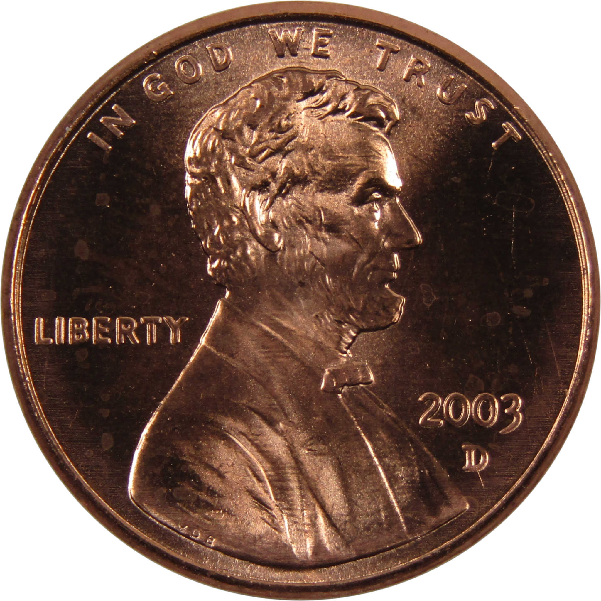 A genuine 2003 D Lincoln Memorial Cent Penny Coin, in BU Uncirculated Mint State Condition