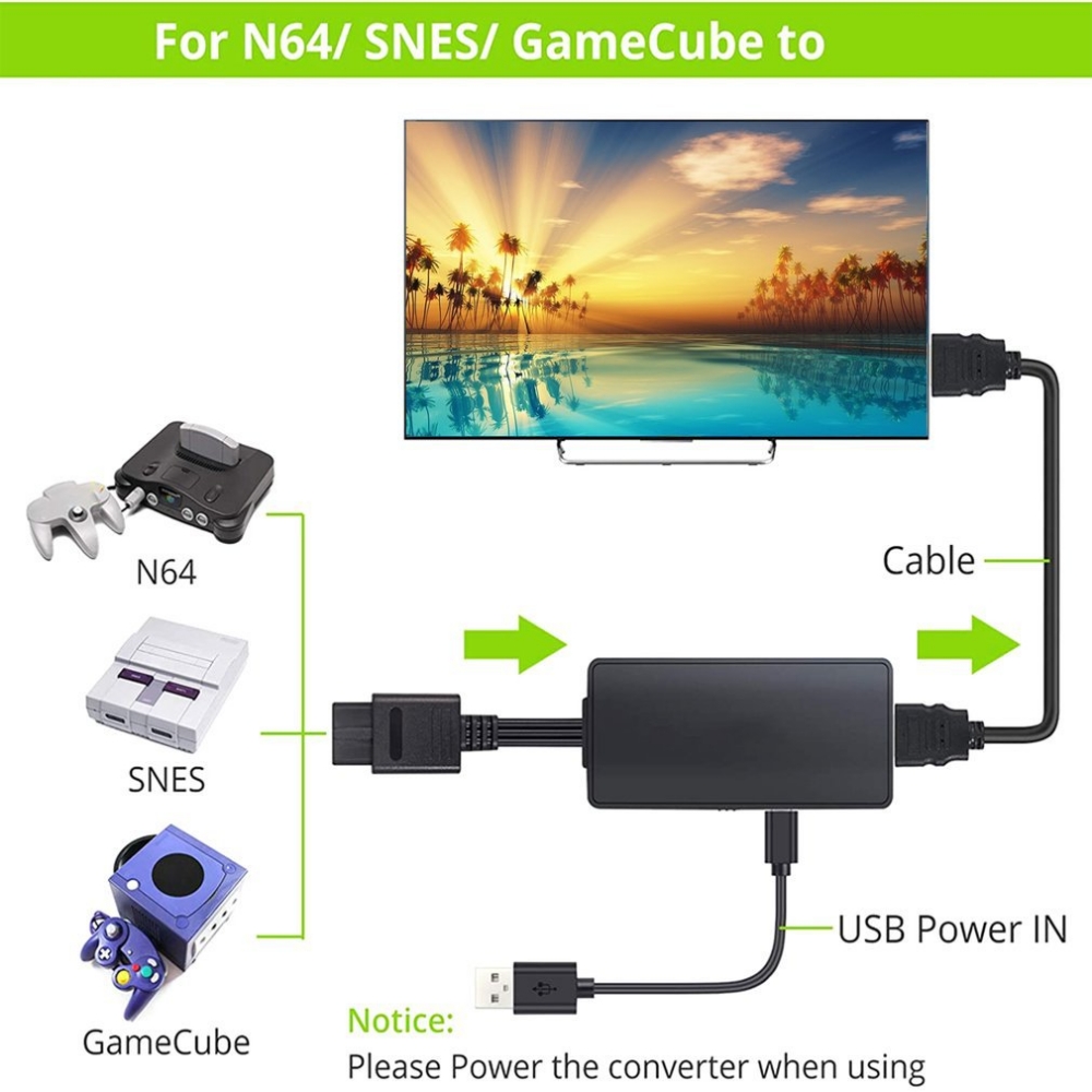 Notes: Only video signal transmission cannot improve video quality. Only convert Nintendo 64/SNES/NGC to HDMI, does not support HDMI to AV. HDMI to AV is not supported, only Nintendo 64 will be converted to HDMI. 4K and 3D are not supported.