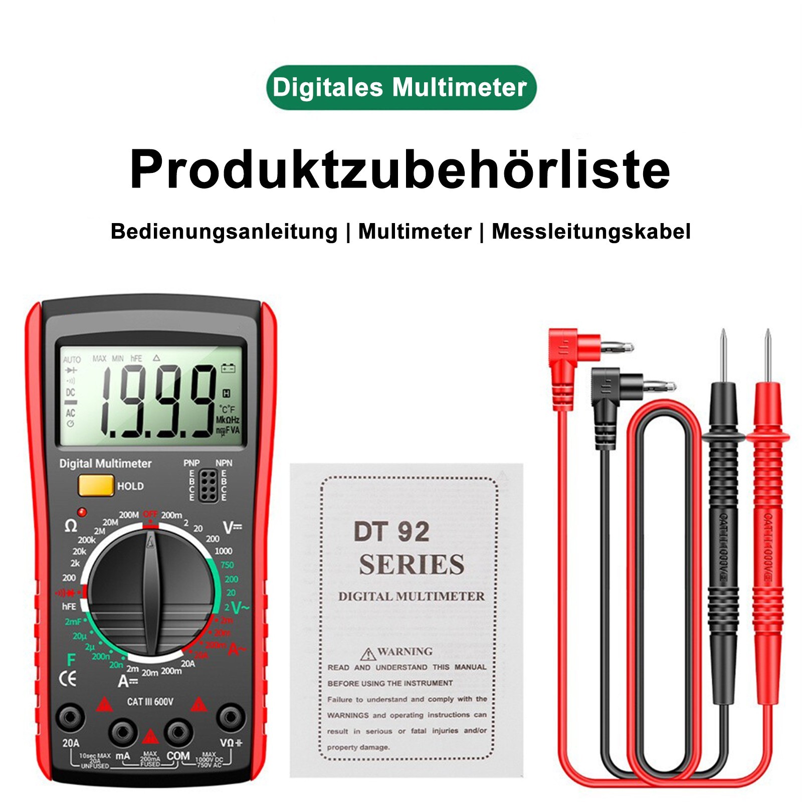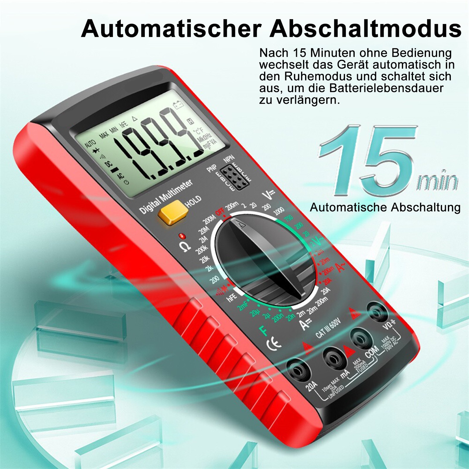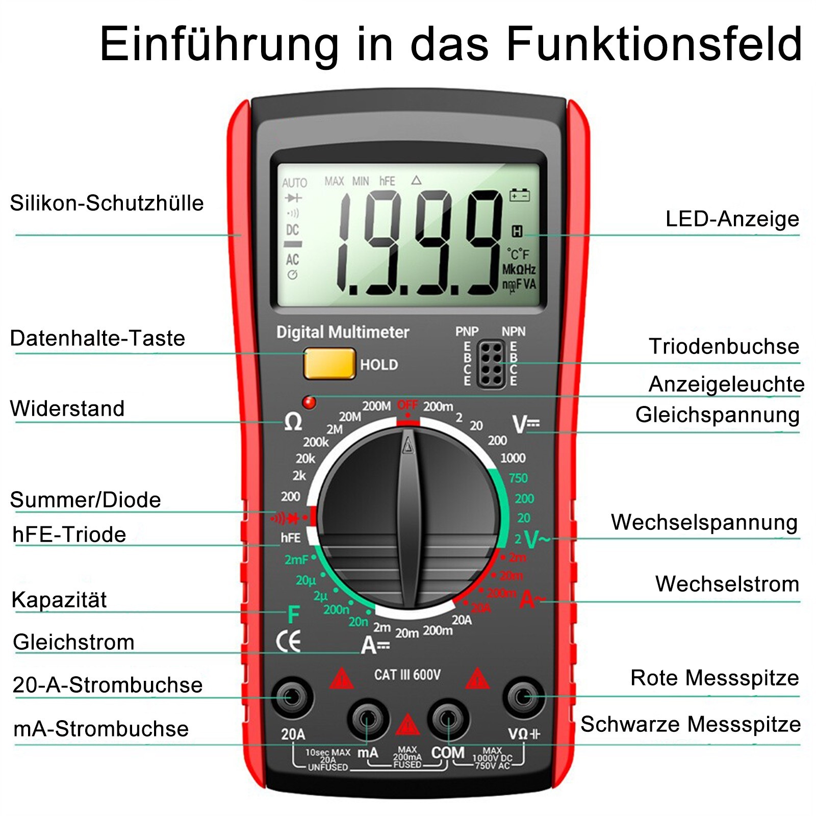 Beschreibung: Großes LCD-Display & Ausgezeichnetes Design: Ausgestattet mit einem hintergrundbeleuchteten LCD-Bildschirm liefert dieses Multimeter auch bei schlechten Lichtverhältnissen klare Messwerte. Es ist in einer roten, weichen Gummischale gehalten und so konstruiert, dass es Stürzen und Stößen standhält und so die Haltbarkeit und Messgenauigkeit erhöht.
