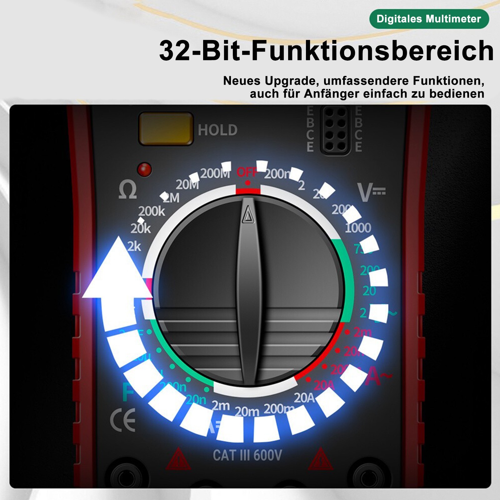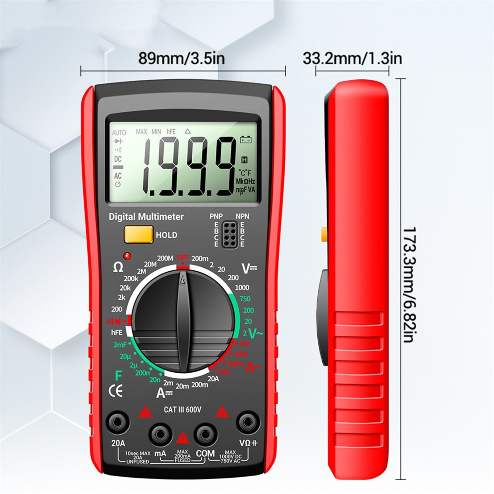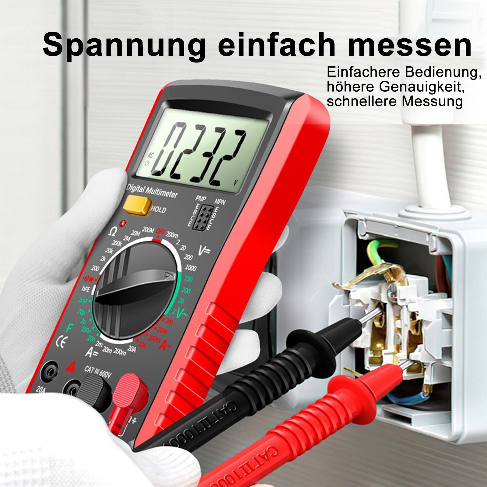 Beschreibung: Großes LCD-Display & Ausgezeichnetes Design: Ausgestattet mit einem hintergrundbeleuchteten LCD-Bildschirm liefert dieses Multimeter auch bei schlechten Lichtverhältnissen klare Messwerte. Es ist in einer roten, weichen Gummischale gehalten und so konstruiert, dass es Stürzen und Stößen standhält und so die Haltbarkeit und Messgenauigkeit erhöht.