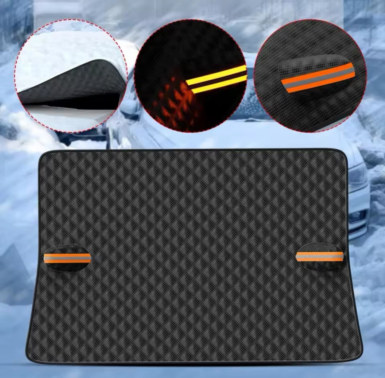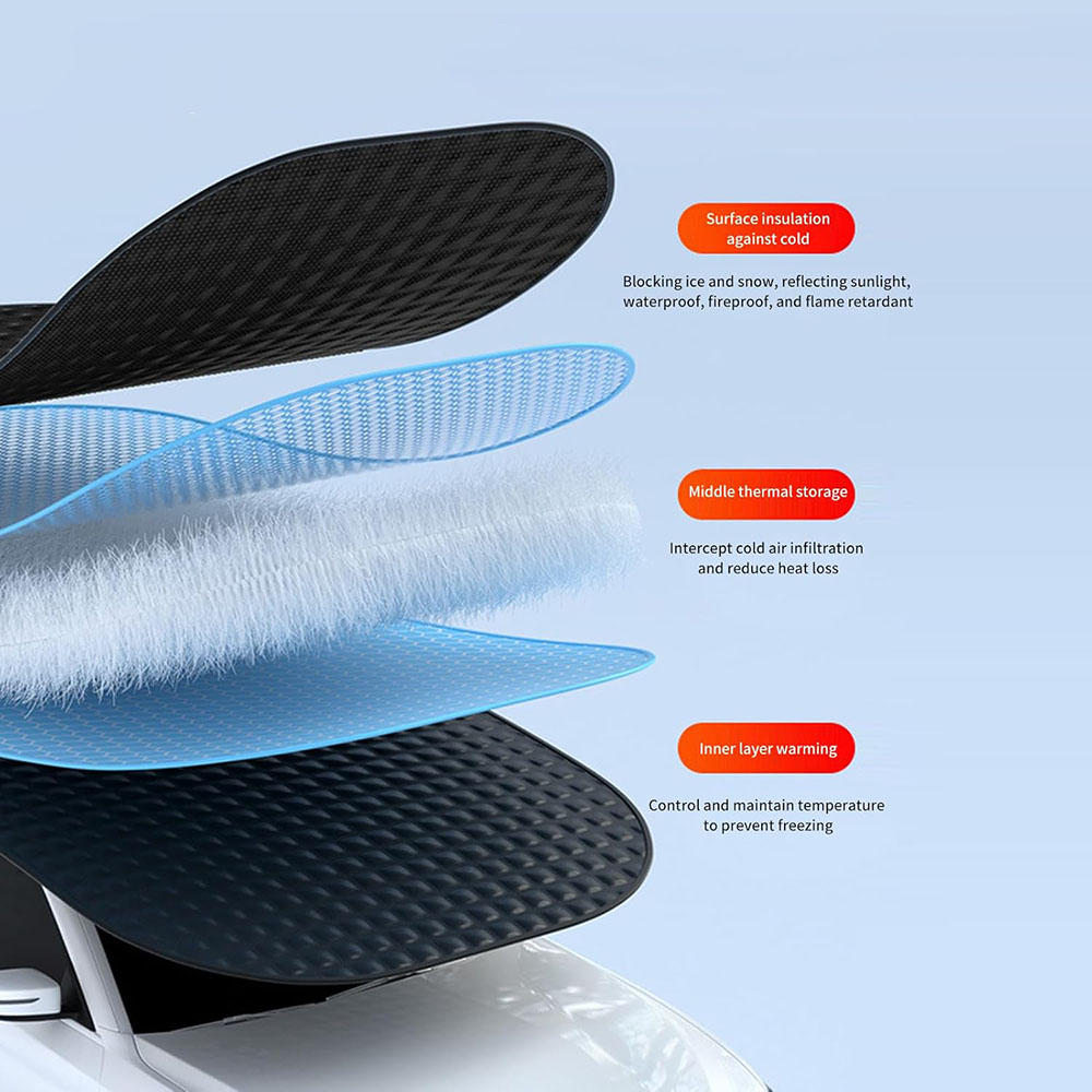 4 Layers Material: The windshield winter cover is made of durable fabric with 4 layers (aluminum foil, spunlaced cotton, warp weft cotton and white lining). Our snow shield windshield is thicker and more durable than the black windshield snow covers on the market.