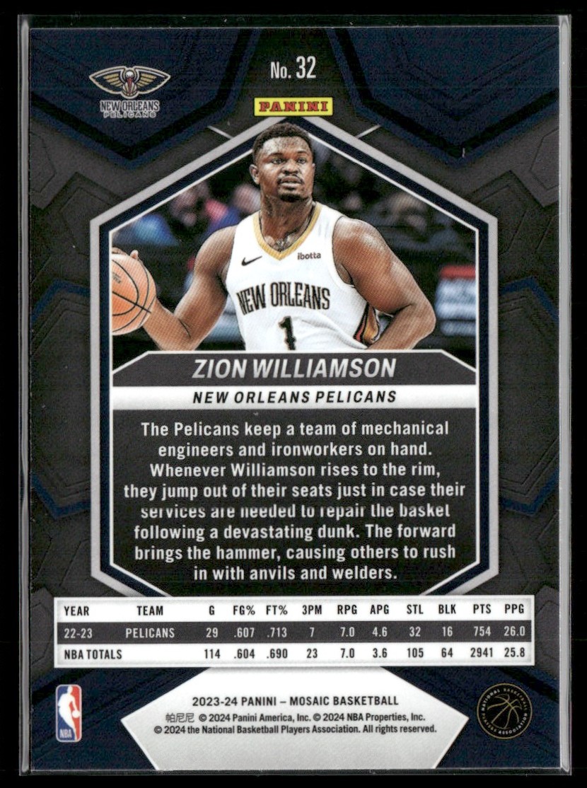 | 2023-24 PANINI MOSAIC ZION WILLIAMSON NEW ORLEANS PELICANS #32 |