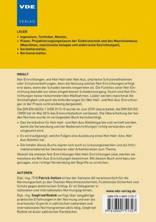 | Untertitel: | Eine Erläuterung unter Berücksichtigung von DIN EN 60204-1 (VDE 0113-1):2019-06 und DIN EN ISO 13850:2016-05 |