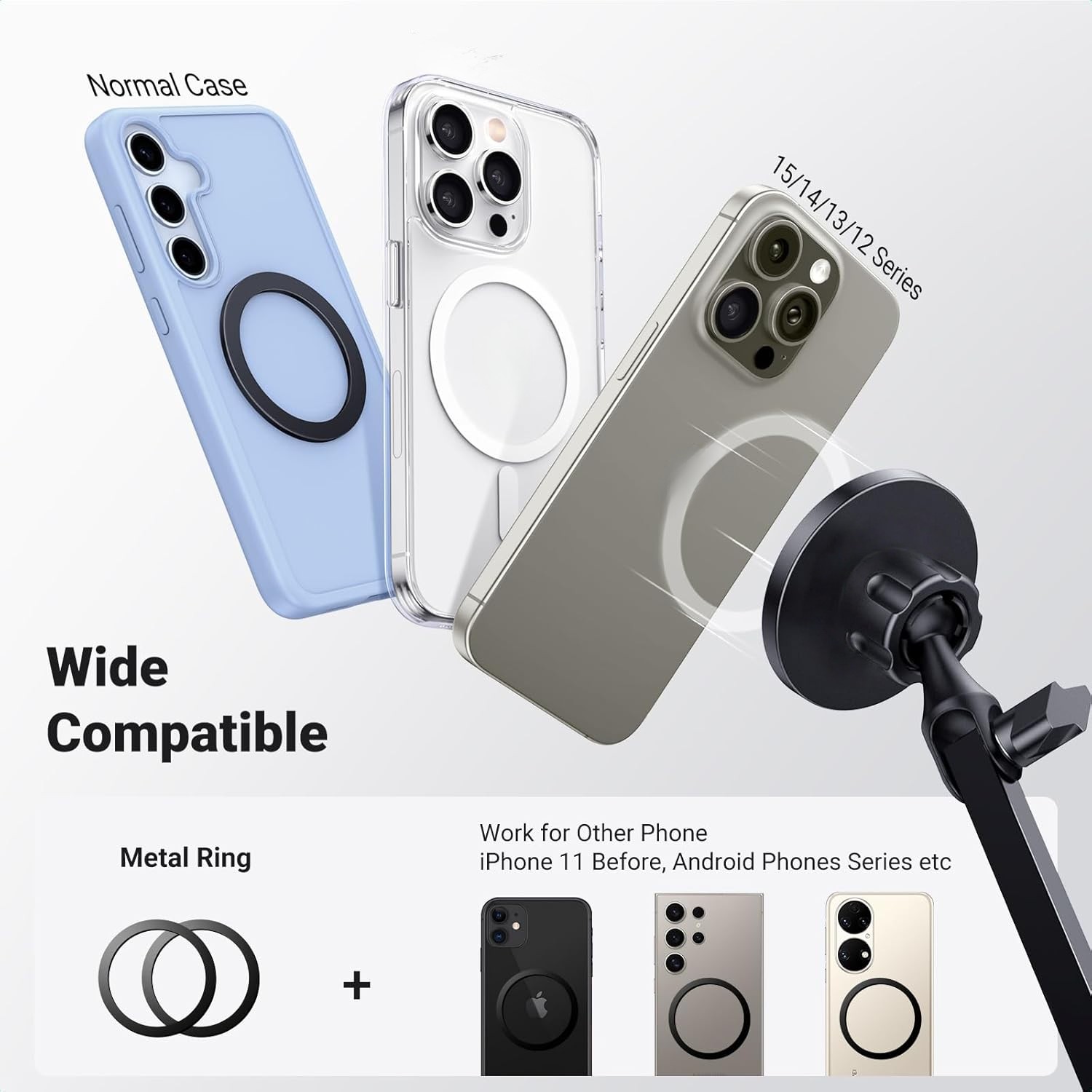 Compatible with the 17/16/15/14/13/12 series and protective cases; paired with a magnetic metal ring, it can also securely hold the 11 series and earlier models, Android phones,