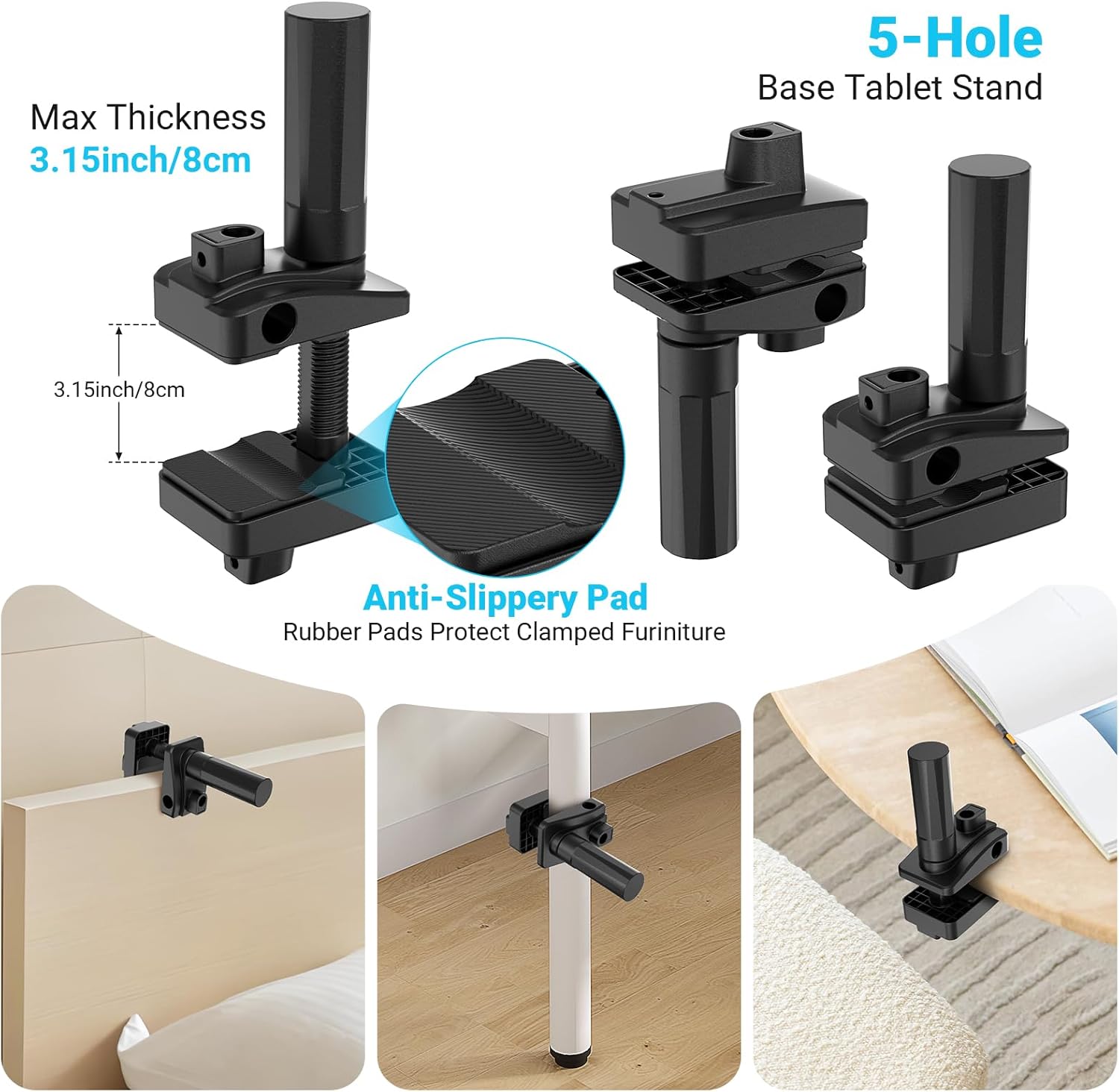 The built-in protective silicone pad ensures a secure grip without scratching furniture, making it compatible with bed frames, nightstands, desks, side tables, chairs, and kitchen countertops—
