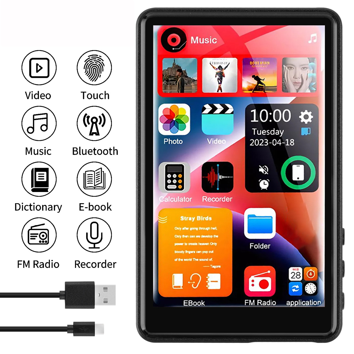 Additional Features: Bluetooth connectivity, photo browsing, FM radio, voice recording, built-in external speaker, e-book reading, electronic dictionary, folder management