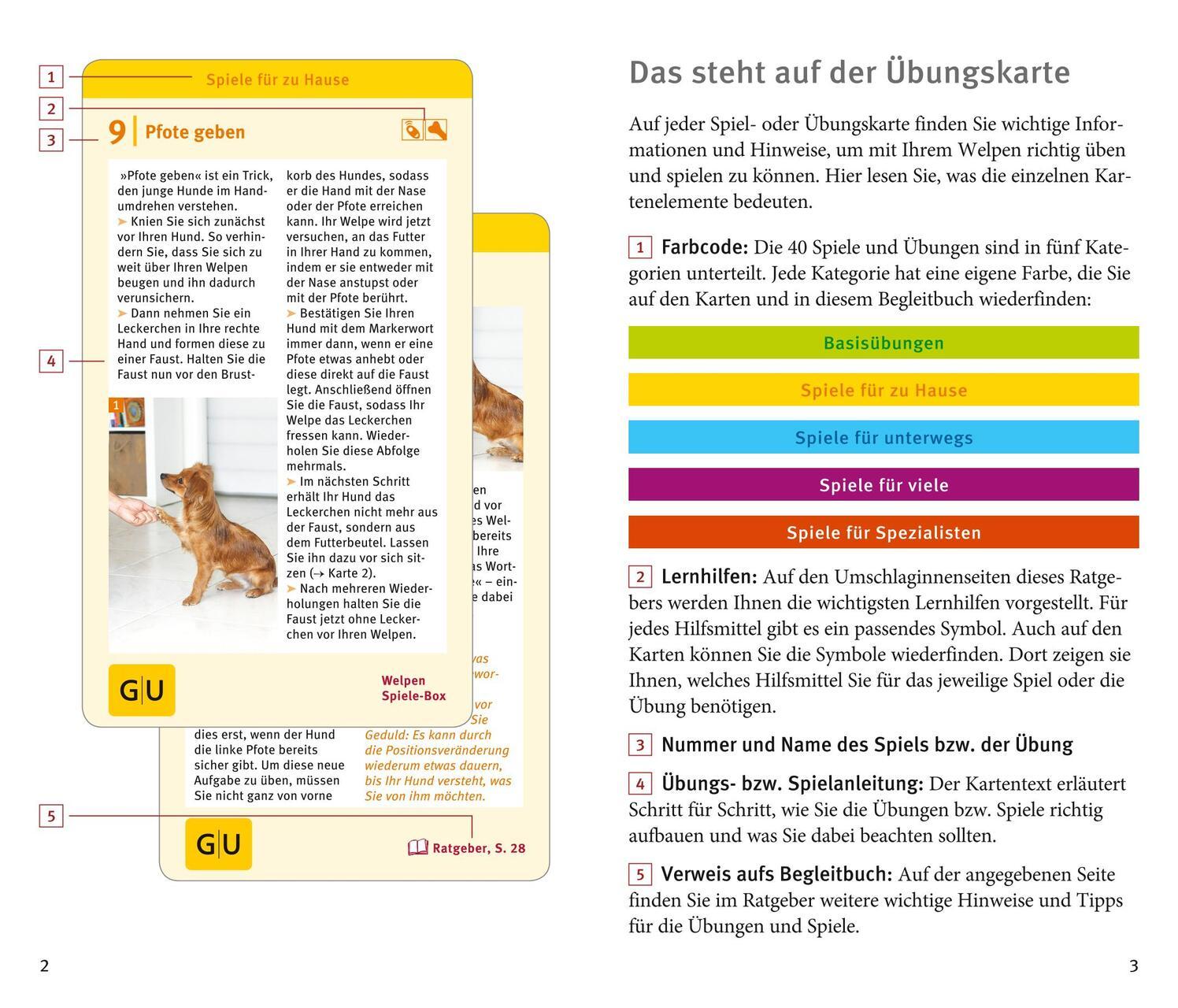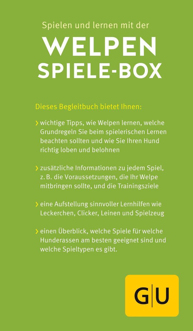 Welpen wollen spielen, spielen, spielen - und das ist auch gut so! Beim Spielen macht Ihr Welpe ganz entscheidende Erfahrungen und lernt alles Wichtige fürs Leben. Die GU Welpen-Spiele-Box hilft Ihnen dabei, Ihren Welpen optimal auf sein Leben vorzubereiten. Sie bekommen die wichtigsten Grundlagen zum richtigen Spielen vermittelt und erfahren, wie Sie mit gezielten und abwechslungsreichen Übungen seine körperliche und geistige Entwicklung fördern und seine Bindung zu Ihnen stärken. Die Basisübungen zur spielerischen Erziehung machen Spaß und legen den entscheidenden Grundstein zum wohlerzogenen Hund. Von den Basisübungen über Spiele für zu Hause und unterwegs bis hin zu den Spielen für Viele und für Spezialisten findet sich für jeden Spiele-Typ, jede Rasse und jede Situation garantiert das Richtige. Dank dem beigelegten Futterbeutel steht dem sofortigen Spielspaß nichts mehr im Weg!