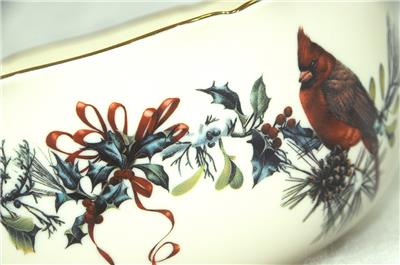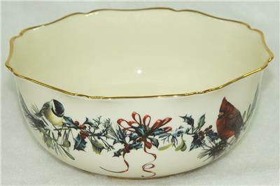 Beautiful Lenox “Winter Greetings” Round Vegetable Serving Bowl, measuring 8 1/2" wide and 3 3/4" tall, featuring the classic cardinal and evergreen design with 24k gold trim. This version also includes the harder-to-find scalloped edge, which adds an elegant, decorative touch and is NOT as commonly seen in current listings.