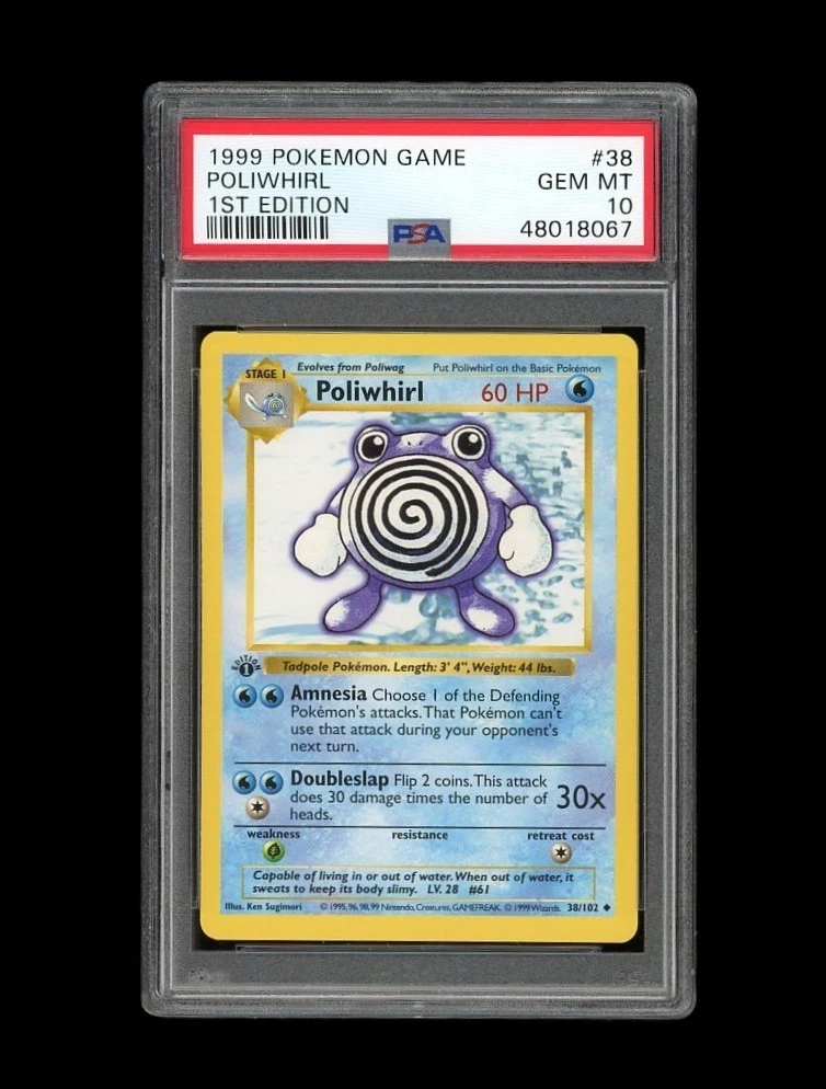 This was the first Poliwhirl released in a set! The 1st edition base set is the most sought after set in pokemon. It was the first set release for a brief period in 1999. The card received the highest grade, PSA 10 Gem Mint.