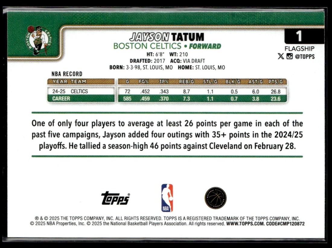 | 2025-26 TOPPS JAYSON TATUM BOSTON CELTICS #1 |