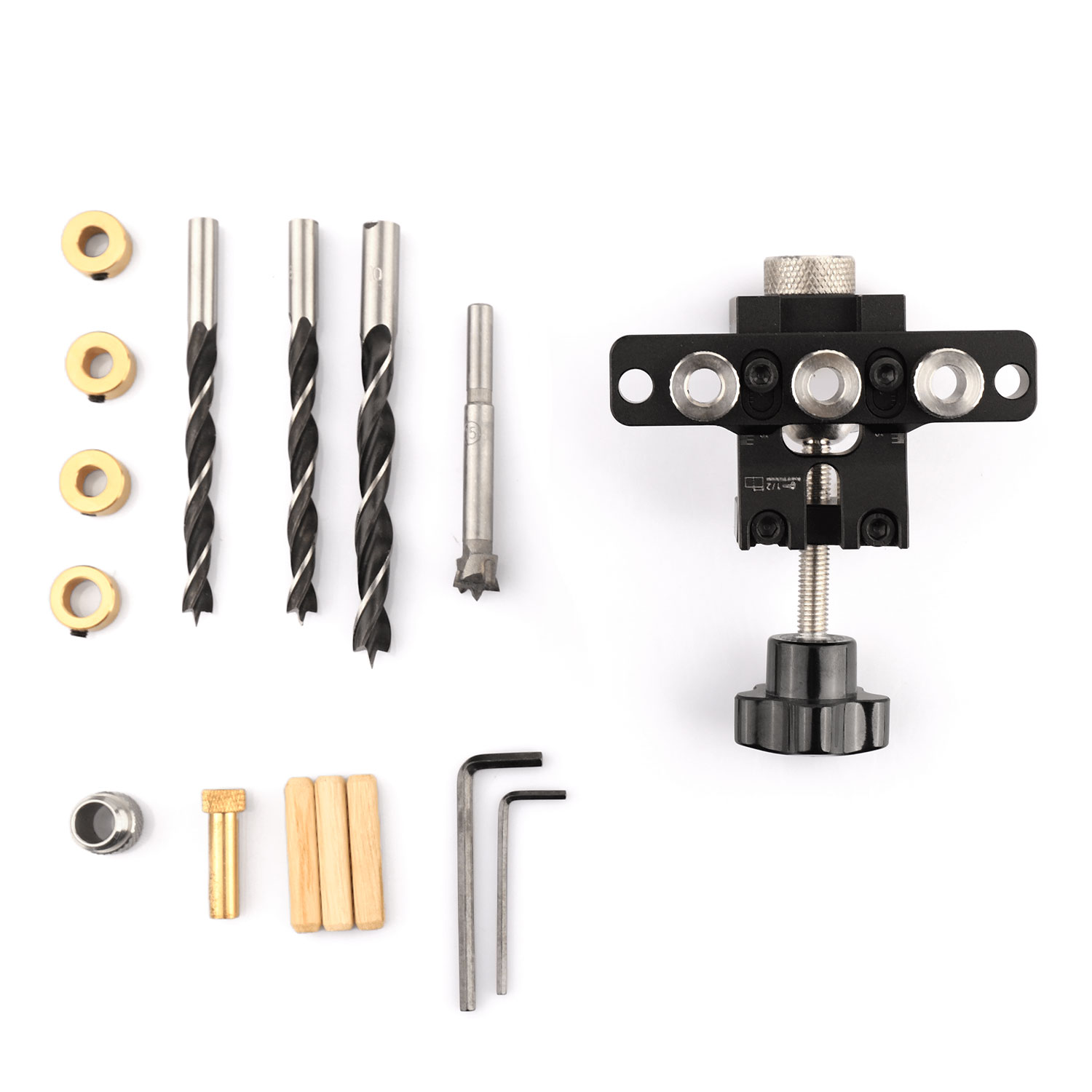- 1 × Main aluminum alloy dowel jig (with 3 pre-installed 8mm stainless steel drill bushings + 1 brass stop block)