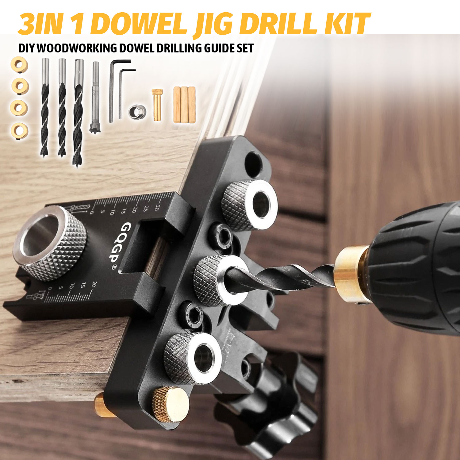 - Multi-Size Compatibility: Includes drill bushing/drill bit assemblies (10mm, 8mm×2, 15mm) + a separate 10mm drill bushing, fitting various dowel sizes for versatile tasks.