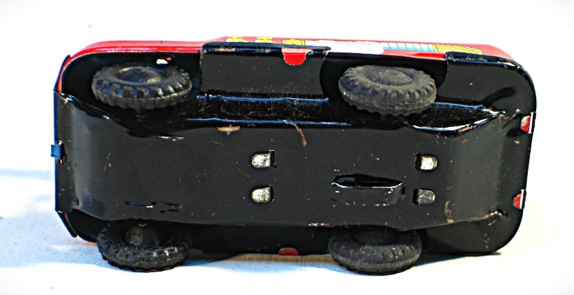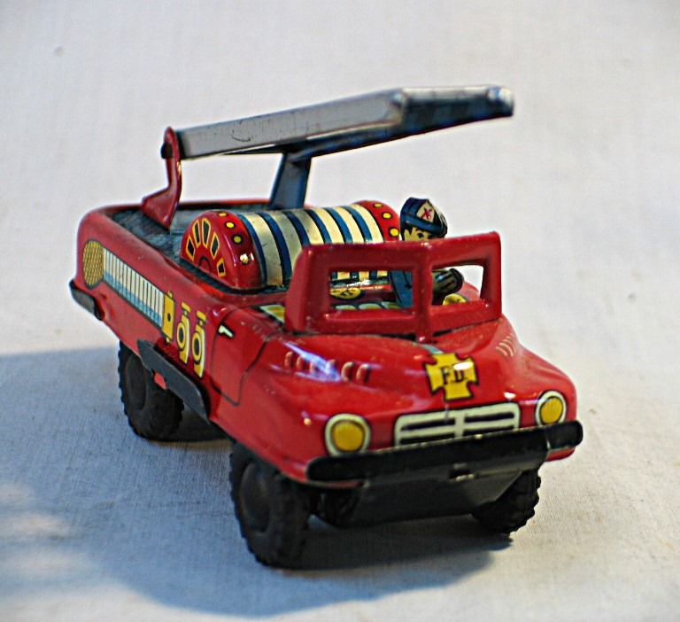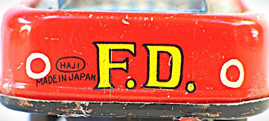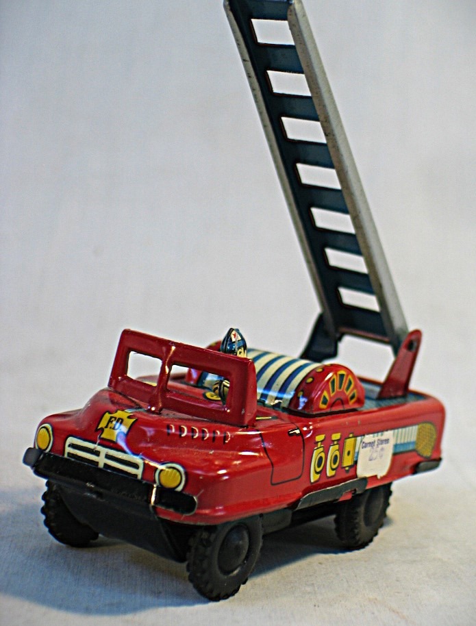 Vintage Small Tin Fire Truck with Ladder - Friction drive made by Haji Japan... Excellent NOS condition, please see photos for details... Still has original price sticker from a Cornet Stores...