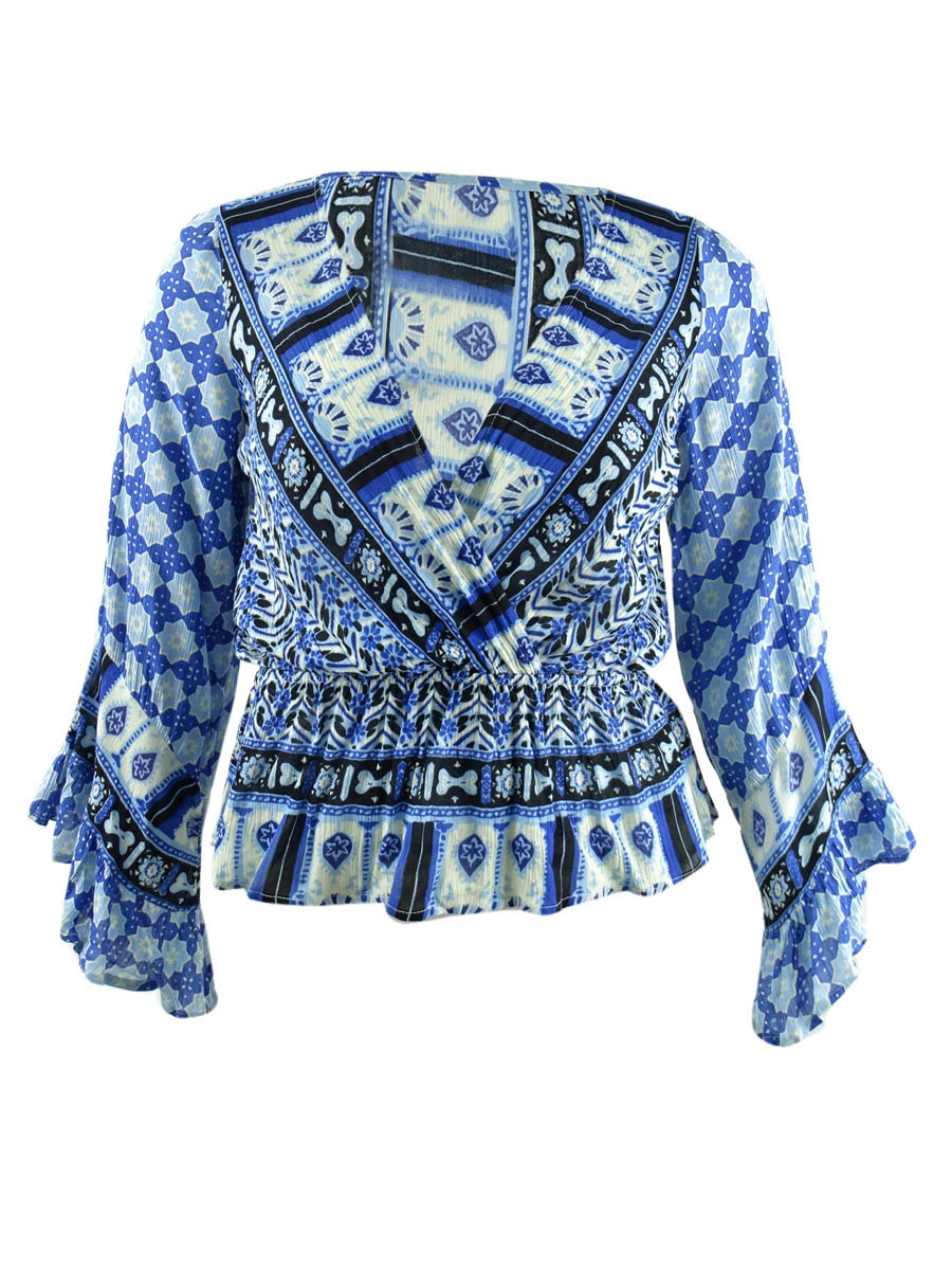 Free People Women's Bell Sleeve Faux Wrap Top (L, Indigo Combo)