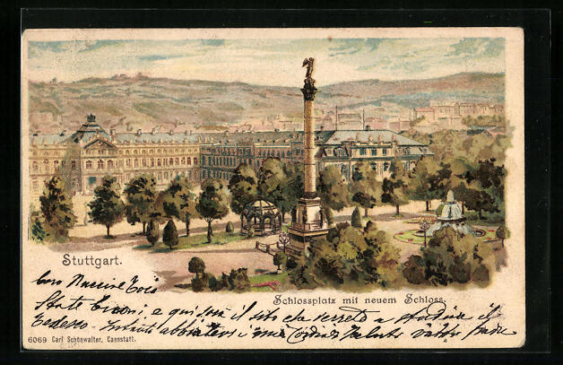 Lithographie Stuttgart, Schlossplatz mit neuem Schloss